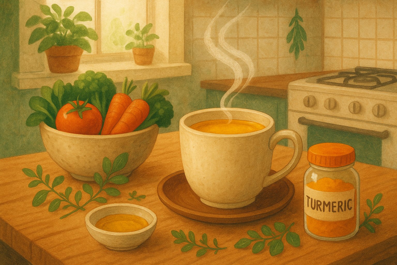 - 강황차 — 따뜻한 물에 강황가루 1작은술과 후추, 꿀을 섞어 아침 공복에 마시면 장을 부드럽게 자극합니다.