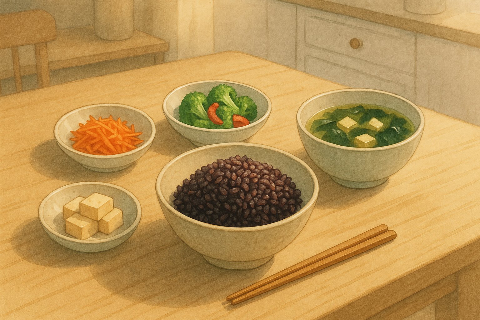 검정쌀을 식단에 쉽게 포함시키기 위해서는 단순히 '밥'으로만 생각하지 말고 다양한 식재료와 조합하여 활용도 있게 섭취하는 것이 중요합니다. 아래는 실제로 구성할 수 있는 하루 식단 예시입니다.