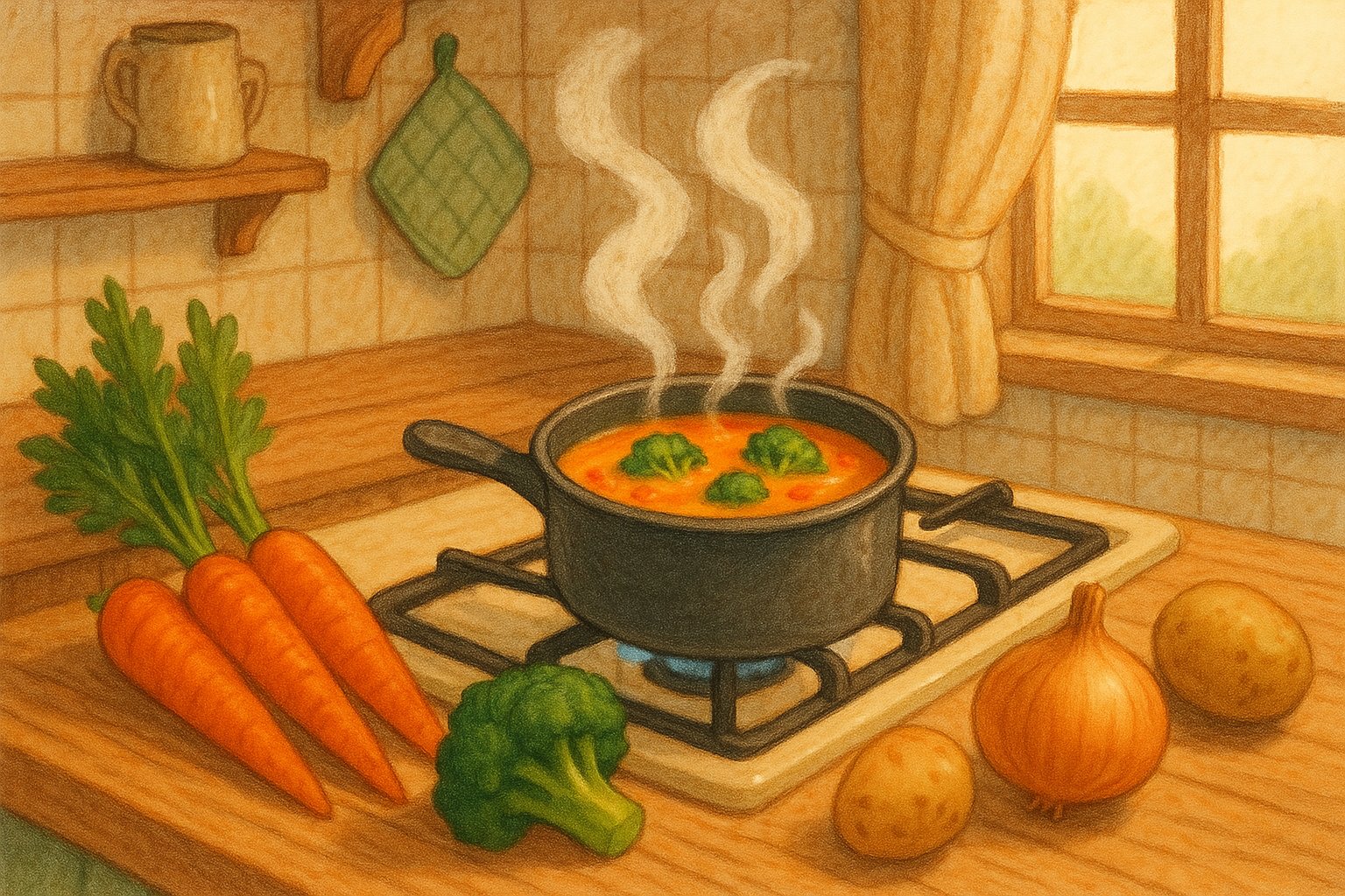 - 1단계 – 재료 준비: 당근 1개, 브로콜리 반 송이, 양파 반 개, 감자 1개, 닭육수 또는 물 400ml, 무염버터 1큰술