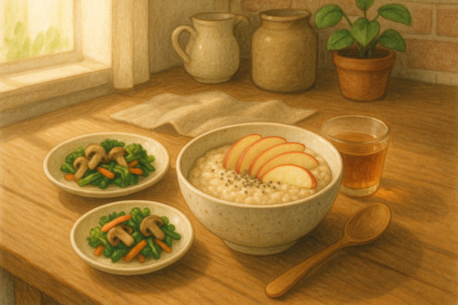 예시: “아침에 귀리 우유 한 컵과 표고버섯을 곁들인 채소볶음으로 식단을 구성해보세요. 베타글루칸과 항산화 성분을 동시에 섭취할 수 있어요.”