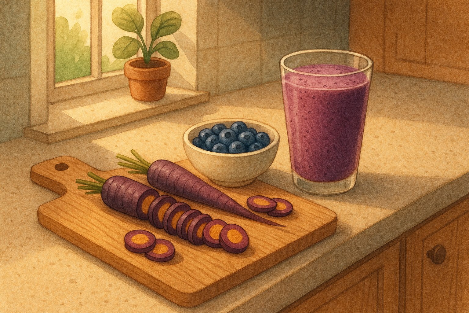 예를 들어, 보라당근을 매일 1/2개씩 섭취하는 것만으로도 하루 안토시아닌 권장량의 60% 이상을 채울 수 있다는 연구 결과도 있습니다. 게다가 생으로 먹어도 좋고, 스무디나 샐러드로 활용하기도 간편해요.