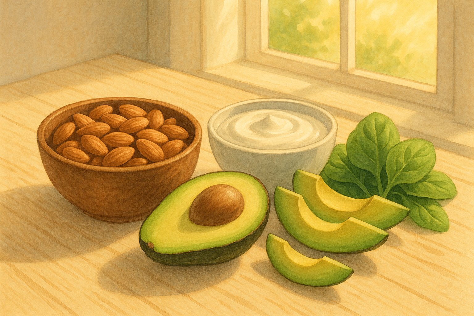 예시 루틴: 아침 공복에 따뜻한 물 한 컵 → 아몬드 23알 + 플레인 요거트 → 20분 산책 → 업무 중간 스트레칭 → 저녁에 시금치나 아보카도 포함한 식사
