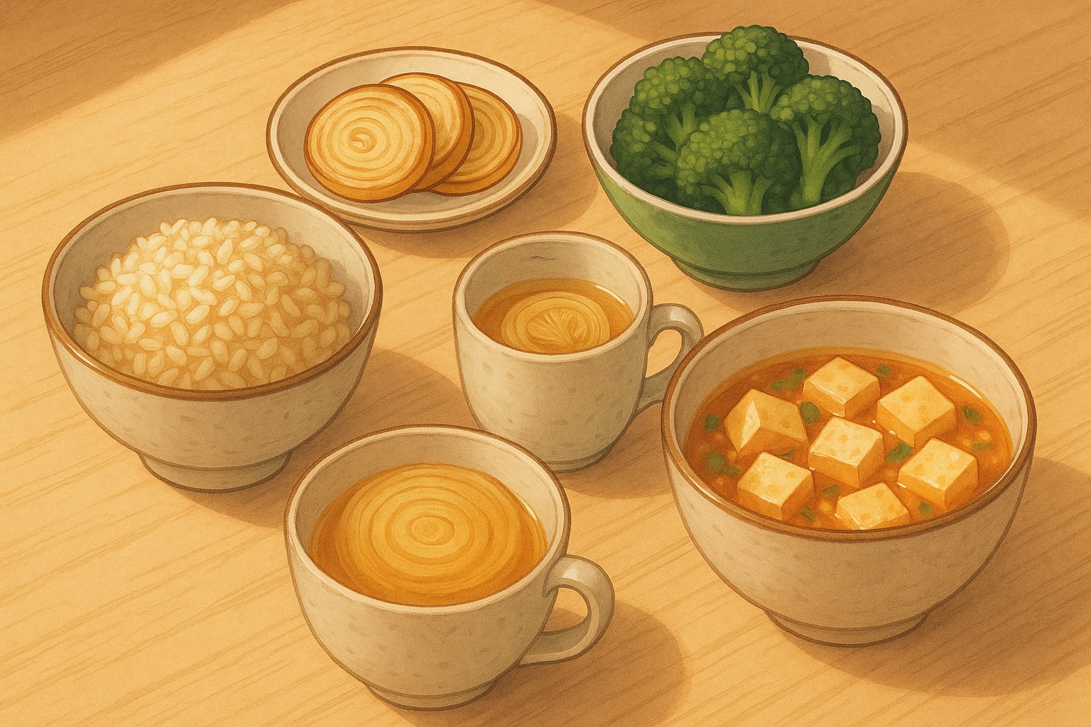 | 아침 | 현미밥 + 달걀프라이 + 구운 양파와 브로콜리 + 된장국 |