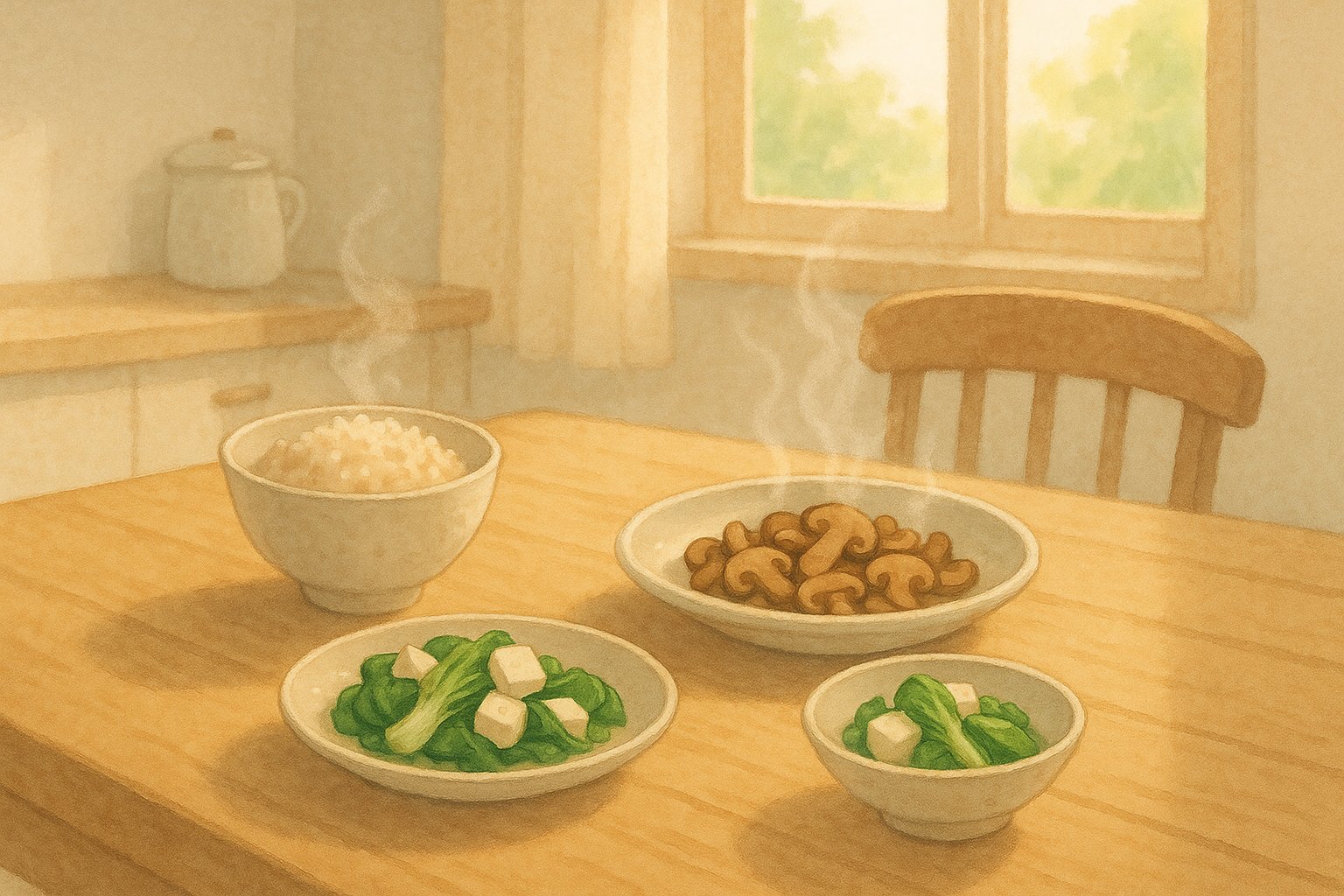 - 아침 – 청경채 달걀 오믈렛 + 현미밥 + 미소된장국