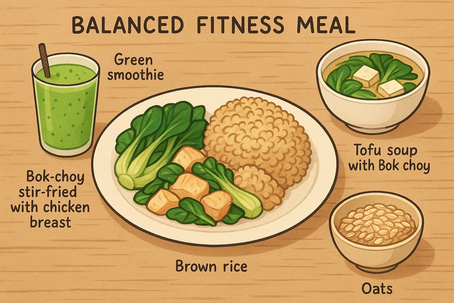예: “청경채 + 삶은 렌틸콩 + 닭가슴살 + 발사믹 드레싱” 조합은 저지방, 고단백, 고식이섬유 식사로 운동 직후에도 이상적입니다.